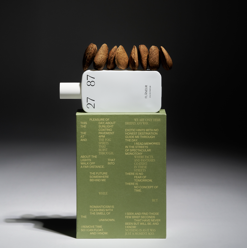 «Flâneur» invita a esplorare oltre i limiti dell'eccellenza e dell'aspirazione. Moderno e visionario, con un accento di malinconia, si apre su note verdi e lievemente amarognole di assenzio. Il calore del legno di cashmere, tiglio e fiore di mandorlo avvolge la composizione, arricchita da una freschezza di bergamotto e una base vibrante di anice stellato, ambra secca e vetiver. Il risultato è una fragranza secca ma avvolgente, capace di suscitare nostalgia e una presenza intensa.